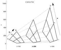 The effects of an additional independent variable can be visualized by multiple carpets on the same plot corresponding to different values of the third independent variable. If the intersections are connected, a lattice appears. For an intermediate value, a whole carpet can be interpolated using the lattice lines.[2] This technique may result in too much overlapping of carpets in a true carpet plot but is always possible for a cheater plot because the separation of the additional carpets can be adjusted on the phantom horizontal axis.