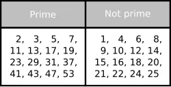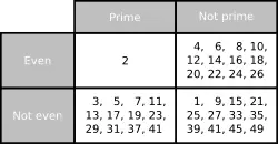 A Carroll diagram, Lewis Carroll's square, biliteral diagram or a two-way table is a diagram used for grouping things in a yes/no fashion. Numbers or objects are either categorised as 'x' (having an attribute x) or 'not x' (not having an attribute 'x'). They are named after Lewis Carroll, the pseudonym of polymath Charles Lutwidge Dodgson.[1][2]