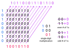 Given two numbers and , with denoting the bits of these numbers, the carry-less product of these two numbers is defined to be , with each bit computed as the exclusive or of products of bits from the input numbers as follows:[1]