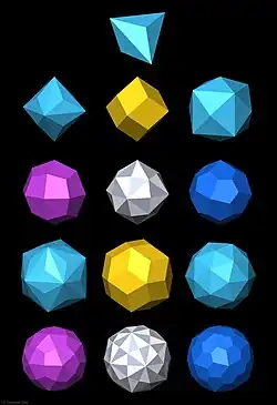 The Catalan solids are face-transitive or isohedral meaning that their faces are symmetric to one another, but they are not vertex-transitive because their vertices are not symmetric. Their dual, the Archimedean solids, are vertex-transitive but not face-transitive. Each Catalan solid has constant dihedral angles, meaning the angle between any two adjacent faces is the same.[1] Additionally, two Catalan solids, the rhombic dodecahedron and rhombic triacontahedron, are edge-transitive, meaning their edges are symmetric to each other. Some Catalan solids were discovered by Johannes Kepler during his study of zonohedra, and Eugene Catalan completed the list of the thirteen solids in 1865.[4]