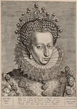 Catherine de Parthenay, Viscountess and Princess of Rohan (1554–1631) was a French noblewoman, mathematician, philosopher, poet, playwright, and translator.[3][4] She studied with the mathematician François Viète and was considered one of the most brilliant women of the era. De Parthenay was married twice, first to the Protestant baron Charles de Quelennec.[4] During the four years of their marriage, Quelennec was often away and was reported to have dishonored his wife. After she reached out for support from Jeanne d'Albret, Queen of Navarre, he kidnapped and imprisoned her in a castle in Brittany. During the period that she was confined, her mother notified the Duke of Anjou (future King Henri III), his mother Catherine de' Medici, and ultimately King Charles IX for resolution. Quelennec died soon after. She later married René II, Viscount of Rohan.