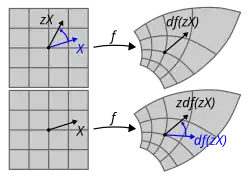 (Note that if is complex differentiable at , it is also real differentiable and the Jacobian of at is the complex scalar , regarded as a real-linear map of , since the limit as .)