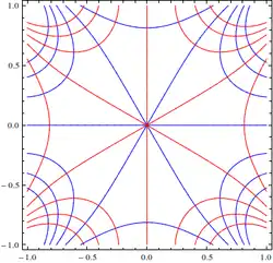 A holomorphic function can therefore be visualized by plotting the two families of level curves and . Near points where the gradient of u (or, equivalently, v) is not zero, these families form an orthogonal family of curves. At the points where , the stationary points of the flow, the equipotential curves of intersect. The streamlines also intersect at the same point, bisecting the angles formed by the equipotential curves.