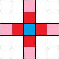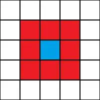 One way to simulate a two-dimensional cellular automaton is with an infinite sheet of graph paper along with a set of rules for the cells to follow. Each square is called a "cell" and each cell has two possible states, black and white. The neighborhood of a cell is the nearby, usually adjacent, cells. The two most common types of neighborhoods are the von Neumann neighborhood and the Moore neighborhood.[5] The former, named after the founding cellular automaton theorist, consists of the four orthogonally adjacent cells.[5] The latter includes the von Neumann neighborhood as well as the four diagonally adjacent cells.[5] For such a cell and its Moore neighborhood, there are 512 (= 29) possible patterns. For each of the 512 possible patterns, the rule table would state whether the center cell will be black or white on the next time interval. Conway's Game of Life is a popular version of this model. Another common neighborhood type is the extended von Neumann neighborhood, which includes the two closest cells in each orthogonal direction, for a total of eight.[5] The general equation for the total number of automata possible is kks, where k is the number of possible states for a cell, and s is the number of neighboring cells (including the cell to be calculated itself) used to determine the cell's next state.[6] Thus, in the two-dimensional system with a Moore neighborhood, the total number of automata possible would be 229, or 1.34×10154.
