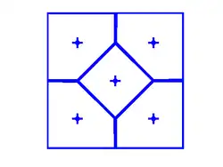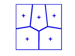 In geometry, a centroidal Voronoi tessellation (CVT) is a special type of Voronoi tessellation in which the generating point of each Voronoi cell is also its centroid (center of mass). It can be viewed as an optimal partition corresponding to an optimal distribution of generators. A number of algorithms can be used to generate centroidal Voronoi tessellations, including Lloyd's algorithm for K-means clustering or Quasi-Newton methods like BFGS. [1]
