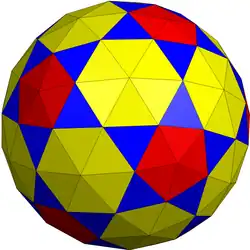 Its dual, the hexapentakis chamfered dodecahedron has 240 triangle faces (grouped as 60 (blue), 60 (red) around 12 5-fold symmetry vertices and 120 around 20 6-fold symmetry vertices), 360 edges, and 122 vertices.
