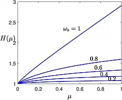 If the equality is satisfied in the above condition, it is called conservative case, otherwise non-conservative. Albedo is given by . An alternate form which would be more useful in calculating the H function numerically by iteration was derived by Chandrasekhar as,