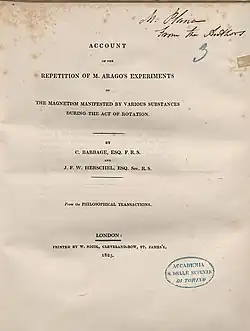 With Herschel, Babbage worked on the electrodynamics of Arago's rotations, publishing in 1825. Their explanations were only transitional, being picked up and broadened by Michael Faraday. The phenomena are now part of the theory of eddy currents, and Babbage and Herschel missed some of the clues to unification of electromagnetic theory, staying close to Ampère's force law.[32]