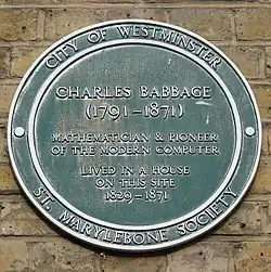 Babbage's birthplace is disputed, but according to the Oxford Dictionary of National Biography he was most likely born at 44 Crosby Row, Walworth Road, London, England.[11] A blue plaque on the junction of Larcom Street and Walworth Road commemorates the event.[12]