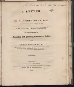 - ↑ Campbell-Kelly, Martin; Babbage, Charles (1994). "Ch 26". Passages from the Life of a Philosopher. Pickering & Chatto Publishers. p. 342. ISBN 978-1-85196-040-8.