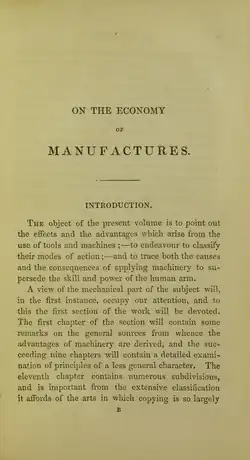 Babbage published On the Economy of Machinery and Manufactures (1832), on the organisation of industrial production. It was an influential early work of operational research.[74] John Rennie the Younger in addressing the Institution of Civil Engineers on manufacturing in 1846 mentioned mostly surveys in encyclopaedias, and Babbage's book was first an article in the Encyclopædia Metropolitana, the form in which Rennie noted it, in the company of related works by John Farey Jr., Peter Barlow and Andrew Ure.[75] From An essay on the general principles which regulate the application of machinery to manufactures and the mechanical arts (1827), which became the Encyclopædia Metropolitana article of 1829, Babbage developed the schematic classification of machines that, combined with discussion of factories, made up the first part of the book. The second part considered the "domestic and political economy" of manufactures.[76]