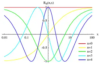 Plot of the Chebyshev rational functions for n = 0, 1, 2, 3, 4 for 0.01 ≤ x ≤ 100, log scale.