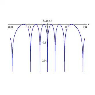 Plot of the absolute value of the seventh-order (n = 7) Chebyshev rational function for 0.01 ≤ x ≤ 100. Note that there are n zeroes arranged symmetrically about x = 1 and if x0 is a zero, then 1/x0 is a zero as well. The maximum value between the zeros is unity. These properties hold for all orders.