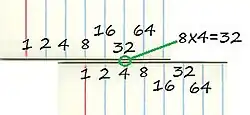 With two logarithmic scales, the act of positioning the top scale to start at the bottom scale's label for corresponds to shifting the top logarithmic scale by a distance of . This aligns each top scale's number at offset with the bottom scale's number at position . Because , the mark on the bottom scale at that position corresponds to . With x=2 and y=3 for example, by positioning the top scale to start at the bottom scale's 2, the result of the multiplication 3×2=6 can then be read on the bottom scale under the top scale's 3: