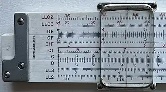 | LL0N (or LL/N) and LLN | log-log folded and scales, for working with logarithms of any base and arbitrary exponents. 4, 6, or 8 scales of this type are commonly seen. |