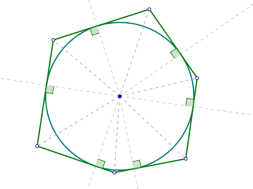 In mathematics and particularly in elementary geometry, a circumgon is a geometric figure which circumscribes some circle, in the sense that it is the union of the outer edges of non-overlapping triangles each of which has a vertex at the center of the circle and opposite side on a line that is tangent to the circle.[1]: p. 855 The limiting case in which part or all of the circumgon is a circular arc is permitted. A circumgonal region is the union of those triangular regions.
