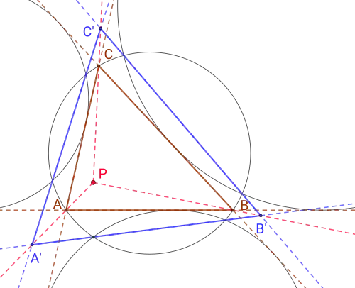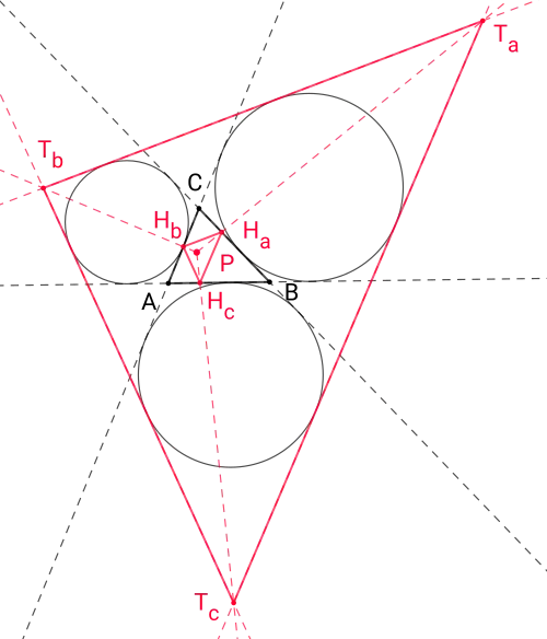 For a given triangle △ABC, let △HAHBHC be its orthic triangle and △TATBTC the triangle formed by the outer tangents to its three excircles. These two triangles are similar and the Clawson point is their center of similarity, therefore the three lines TAHA, TBHB, TCHC connecting their vertices meet in a common point, which is the Clawson point.[2][3]