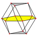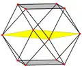 | The FCC arrangement can be oriented in two different planes, square or triangular. These can be seen in the cuboctahedron with 12 vertices representing the positions of 12 neighboring spheres around one central sphere. The HCP arrangement can be seen in the triangular orientation, but alternates two positions of spheres, in a triangular orthobicupola arrangement. | ||