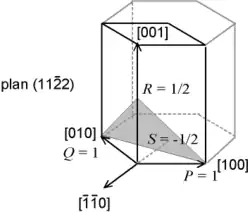 Crystallographic features of HCP systems, such as vectors and atomic plane families, can be described using a four-value Miller index notation ( hkil ) in which the third index i denotes a degenerate but convenient component which is equal to −h − k. The h, i and k index directions are separated by 120°, and are thus not orthogonal; the l component is mutually perpendicular to the h, i and k index directions.