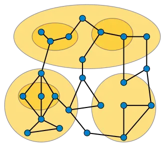 The clustering can be described combinatorially by a collection of subsets of the vertices such that, for each two subsets, either both are disjoint or one is contained in the other. It is not required that the clustering be maximal nor that every vertex belong to a cluster. In a clustered planar drawing, no two edges may cross each other (that is, the graph must be planar), no two of the curves representing clusters may cross each other, an edge may cross a cluster boundary only if it connects a vertex inside the cluster to a vertex outside the cluster, and when an edge and cluster boundary cross they may cross only once.[1] After much past work on the problem, a polynomial-time algorithm testing clustered planarity was found in 2019 by Radoslav Fulek and Csaba Tóth.[2]