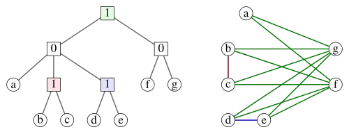 An equivalent way of describing the cograph formed from a cotree is that two vertices are connected by an edge if and only if the lowest common ancestor of the corresponding leaves is labeled by 1. Conversely, every cograph can be represented in this way by a cotree. If we require the labels on any root-leaf path of this tree to alternate between 0 and 1, this representation is unique.[4]