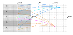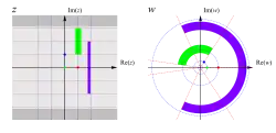 Illustration of the complex exponential function mapping the complex plane, w = exp ⁡(z). The left plane shows a square mesh with mesh size 1, with the three complex numbers 0, 1, and i highlighted. The two rectangles (in magenta and green) are mapped to circular segments, while the lines parallel to the x-axis are mapped to rays emanating from, but not containing the origin. Lines parallel to the y-axis are mapped to circles.