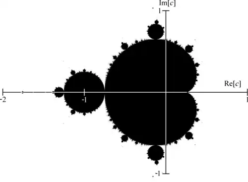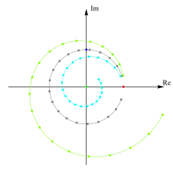 Illustration of the behavior of the sequence for three different values of z (all having the same argument): for the sequence converges to 0 (inner spiral), while it diverges for (outer spiral).