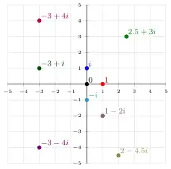 A complex number z can be identified with the ordered pair of real numbers , which may be interpreted as coordinates of a point in a Euclidean plane with standard coordinates, which is then called the complex plane or Argand diagram.[6][7][a] The horizontal axis is generally used to display the real part, with increasing values to the right, and the imaginary part marks the vertical axis, with increasing values upwards.