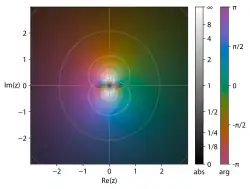 A domain coloring graph of the function (z2 − 1)(z − 2 − i)2/z2 + 2 + 2i. Darker spots mark moduli near zero, brighter spots are farther away from the origin. The color encodes the argument. The function has zeros for ±1, (2 + i) and poles at