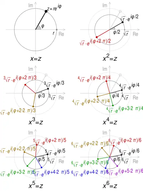 Geometric representation of the 2nd to 6th roots of a complex number z, in polar form reiφ where r = |z| and φ = arg z. If z is real, φ = 0 or π. Principal roots are shown in black.