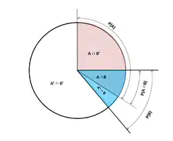 In probability theory, conditional probability is a measure of the probability of an event occurring, given that another event (by assumption, presumption, assertion or evidence) is already known to have occurred.[1] This particular method relies on event A occurring with some sort of relationship with another event B. In this situation, the event A can be analyzed by a conditional probability with respect to B. If the event of interest is A and the event B is known or assumed to have occurred, "the conditional probability of A given B", or "the probability of A under the condition B", is usually written as P(A|B)[2] or occasionally PB(A). This can also be understood as the fraction of probability B that intersects with A, or the ratio of the probabilities of both events happening to the "given" one happening (how many times A occurs rather than not assuming B has occurred): .[3]