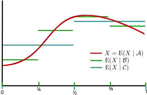 Conditional expectation with respect to a σ-algebra: in this example the probability space is the [0,1] interval with the Lebesgue measure. We define the following σ-algebras: ; is the σ-algebra generated by the intervals with end-points 0, 14, 12, 34, 1; and is the σ-algebra generated by the intervals with end-points 0, 12, 1. Here the conditional expectation is effectively the average over the minimal sets of the σ-algebra.