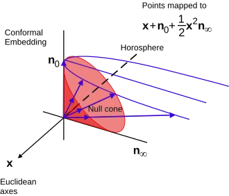 - ↑ The mapping can also be written F : x → −(x − e+) n∞ (x − e+), as given in Hestenes and Sobczyk (1984), p.303.[1] The equivalence of the two forms is noted in Lasenby and Lasenby (2000).[2]