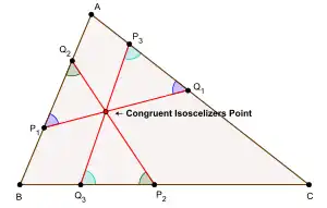 Let △ABC be any triangle. Let P1Q1, P2Q2, P3Q3 be the isoscelizers of the angles A, B, C respectively such that they all have the same length. Then, for a unique configuration, the three isoscelizers P1Q1, P2Q2, P3Q3 are concurrent. The point of concurrence is the congruent isoscelizers point of triangle △ABC.[1]