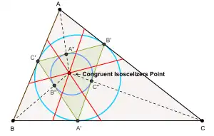 In geometry, the congruent isoscelizers point is a special point associated with a plane triangle. It is a triangle center and it is listed as X(173) in Clark Kimberling's Encyclopedia of Triangle Centers. This point was introduced to the study of triangle geometry by Peter Yff in 1989.[1][2]