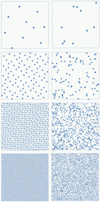 The points plotted below are the first 100, 1000, and 10000 elements in a sequence of the Sobol' type. For comparison, 10000 elements of a sequence of pseudorandom points are also shown. The low-discrepancy sequence was generated by TOMS algorithm 659.[9] An implementation of the algorithm in Fortran is available from Netlib.