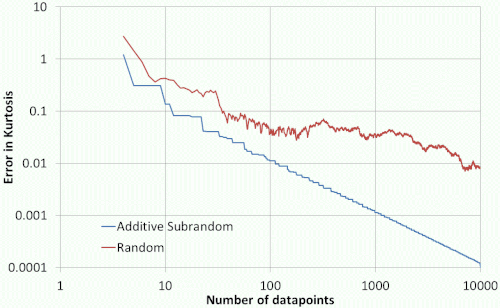 where is a certain constant, depending on the sequence. After Conjecture 2, these sequences are believed to have the best possible order of convergence. Examples below are the van der Corput sequence, the Halton sequences, and the Sobol’ sequences. One general limitation is that construction methods can usually only guarantee the order of convergence. Practically, low discrepancy can be only achieved if is large enough, and for large given s this minimum can be very large. This means running a Monte-Carlo analysis with e.g. variables and points from a low-discrepancy sequence generator may offer only a very minor accuracy improvement .