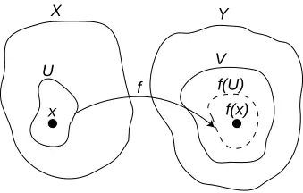 A function is continuous at a point if and only if for any neighborhood V of in Y, there is a neighborhood U of such that