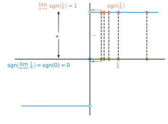 Similarly, the signum or sign function is discontinuous at but continuous everywhere else. Yet another example: the function is continuous everywhere apart from .