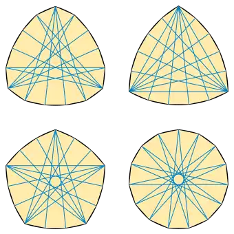 The diameters of the Reinhardt polygons form linear thrackles. An enumeration of linear thrackles may be used to solve the biggest little polygon problem, of finding an n-gon with maximum area relative to its diameter.[7]