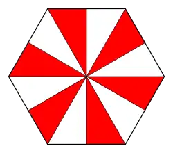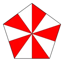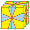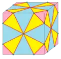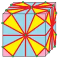 Individual operators can be visualized in terms of fundamental domains (or chambers), as below. Each right triangle is a fundamental domain. Each white chamber is a rotated version of the others, and so is each colored chamber. For achiral operators, the colored chambers are a reflection of the white chambers, and all are transitive. In group terms, achiral operators correspond to dihedral groups Dn where n is the number of sides of a face, while chiral operators correspond to cyclic groups Cn lacking the reflective symmetry of the dihedral groups. Achiral and chiral operators are also called local symmetry-preserving operations (LSP) and local operations that preserve orientation-preserving symmetries (LOPSP), respectively.[7][8][9] LSPs should be understood as local operations that preserve symmetry, not operations that preserve local symmetry. Again, these are symmetries in a topological sense, not a geometric sense: the exact angles and edge lengths may differ.