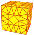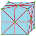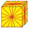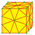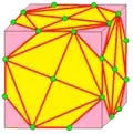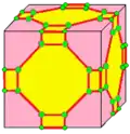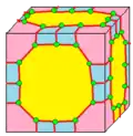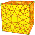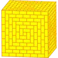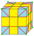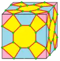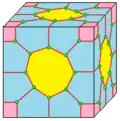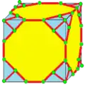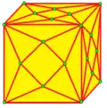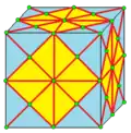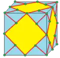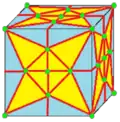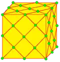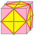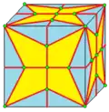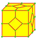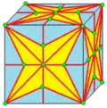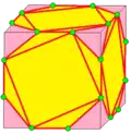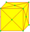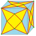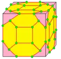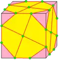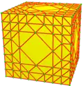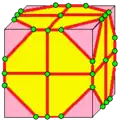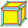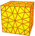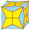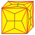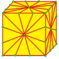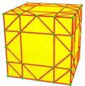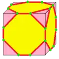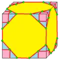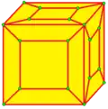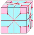Conway and Hart extended the idea of using operators, like truncation as defined by Kepler, to build related polyhedra of the same symmetry. For example, tC represents a truncated cube, and taC, parsed as t(aC), is (topologically) a truncated cuboctahedron. The simplest operator dual swaps vertex and face elements; e.g., a dual cube is an octahedron: dC = O. Applied in a series, these operators allow many higher order polyhedra to be generated. Conway defined the operators a (ambo), b (bevel), d (dual), e (expand), g (gyro), j (join), k (kis), m (meta), o (ortho), s (snub), and t (truncate), while Hart added r (reflect) and p (propellor).[3] Later implementations named further operators, sometimes referred to as "extended" operators.[4][5] Conway's basic operations are sufficient to generate the Archimedean and Catalan solids from the Platonic solids. Some basic operations can be made as composites of others: for instance, ambo applied twice is the expand operation (aa = e), while a truncation after ambo produces bevel (ta = b).