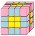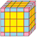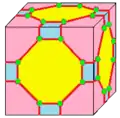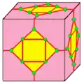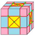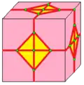 From here on, operations are visualized on cube seeds, drawn on the surface of that cube. Blue faces cross edges of the seed, and pink faces lie over vertices of the seed. There is some flexibility in the exact placement of vertices, especially with chiral operators.