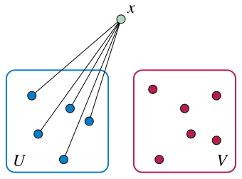 The Rado graph satisfies the following extension property: for every two disjoint finite sets of vertices and , there exists a vertex outside both sets that is connected to all vertices in , but has no neighbors in .[2] For instance, with the binary-number definition of the Rado graph, let Then the nonzero bits in the binary representation of cause it to be adjacent to everything in . However, has no nonzero bits in its binary representation corresponding to vertices in , and is so large that the th bit of every element of is zero. Thus, is not adjacent to any vertex in .[10]