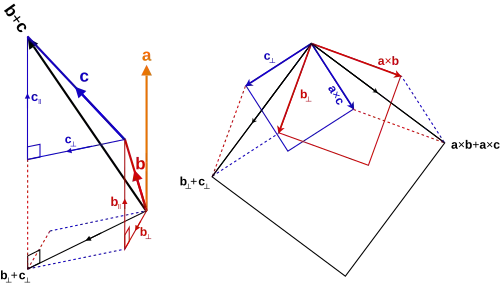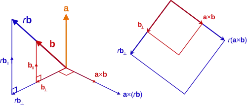 This can be interpreted as the decomposition of a × b into the sum of nine simpler cross products involving vectors aligned with i, j, or k. Each one of these nine cross products operates on two vectors that are easy to handle as they are either parallel or orthogonal to each other. From this decomposition, by using the above-mentioned equalities and collecting similar terms, we obtain: