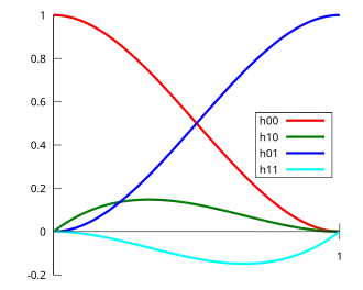 On the unit interval , given a starting point at and an ending point at with starting tangent at and ending tangent at , the polynomial can be defined by where t ∈ [0, 1].