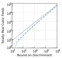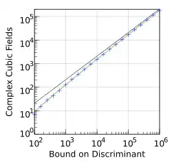 The study of the number of cubic fields whose discriminant is less than a given bound is a current area of research. Let N+(X) (respectively N−(X)) denote the number of totally real (respectively complex) cubic fields whose discriminant is bounded by X in absolute value. In the early 1970s, Harold Davenport and Hans Heilbronn determined the first term of the asymptotic behaviour of N±(X) (i.e. as X goes to infinity).[13][14] By means of an analysis of the residue of the Shintani zeta function, combined with a study of the tables of cubic fields compiled by Karim Belabas (Belabas 1997) and some heuristics, David P. Roberts conjectured a more precise asymptotic formula:[15]