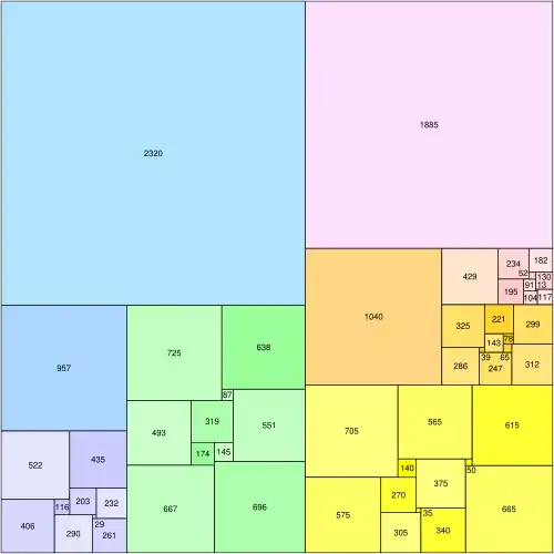 - ↑ Duijvestijn, A. J. W. (1978). "Simple perfect squared square of lowest order". Journal of Combinatorial Theory, Series B. 25 (2): 240–243. doi:10.1016/0095-8956(78)90041-2. MR 0511994.