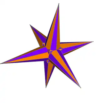 The triangles have one angle of , one of and one of . The dihedral angle equals . Part of each triangle lies within the solid, hence is invisible in solid models.