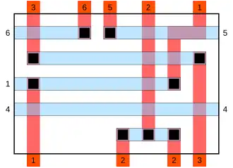 An early motivating application for cutwidth involved channel routing in VLSI design, in which components arranged along the top and bottom of a rectangular region of an integrated circuit should be connected by conductors that connect pairs pins attached to the components. If the components are free to be arranged into different left-to-right orders, but the pins of each component must remain contiguous, then this can be translated into a problem of choosing a linear arrangement of a graph with a vertex for each component and an edge for each pin-to-pin connection. The cutwidth of the graph controls the number of channels needed to route the circuit.[5]